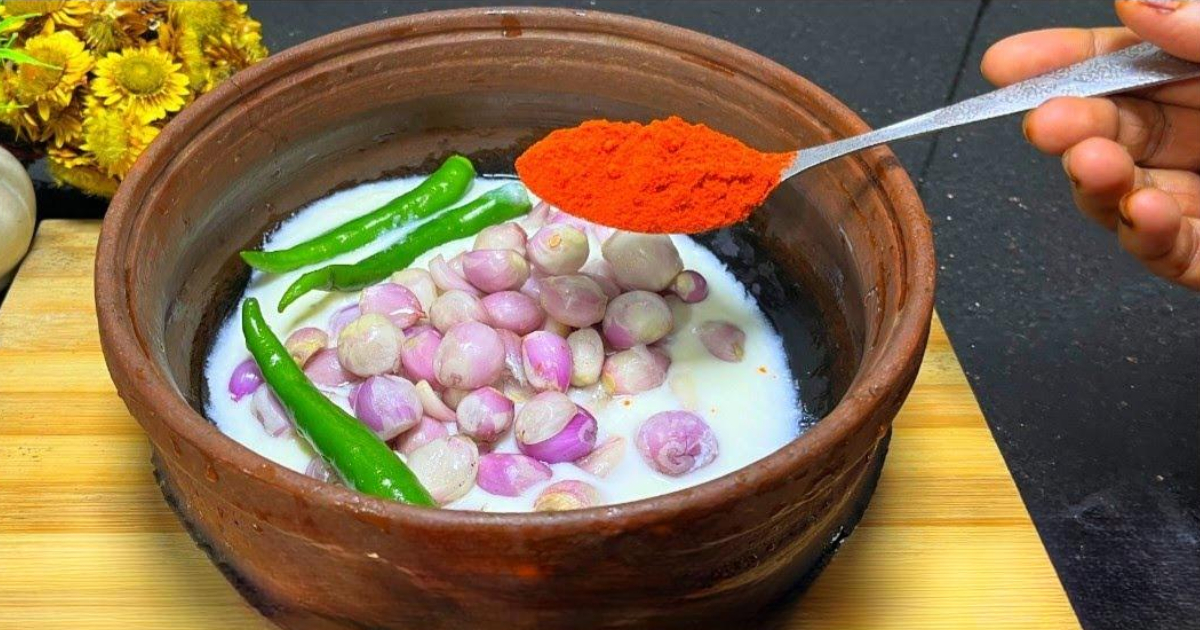 ആദ്യം തന്നെ ഒരു മൺചട്ടിയിലേക്ക് രണ്ട് കപ്പ് അളവിൽ കട്ടി തൈര് ഒഴിച്ചു കൊടുക്കുക. അതിലേക്ക് ഏകദേശം 35 ഓളം ചെറിയ ഉള്ളി തോലുകളഞ്ഞ് വൃത്തിയാക്കിയത് ഇട്ടുകൊടുക്കുക. അതോടൊപ്പം രണ്ടു വലിയ പച്ചമുളക് കീറിയതും എരിവിന് ആവശ്യമായ മുളകുപൊടിയും, ഗരം മസാലയും, ആവശ്യത്തിന് ഉപ്പും ചേർത്ത് നല്ലതുപോലെ ഇളക്കി യോജിപ്പിച്ച് എടുക്കുക. ശേഷം ഈയൊരു കൂട്ട് കുറച്ചുനേരം റസ്റ്റ് ചെയ്യാനായി വക്കുക.