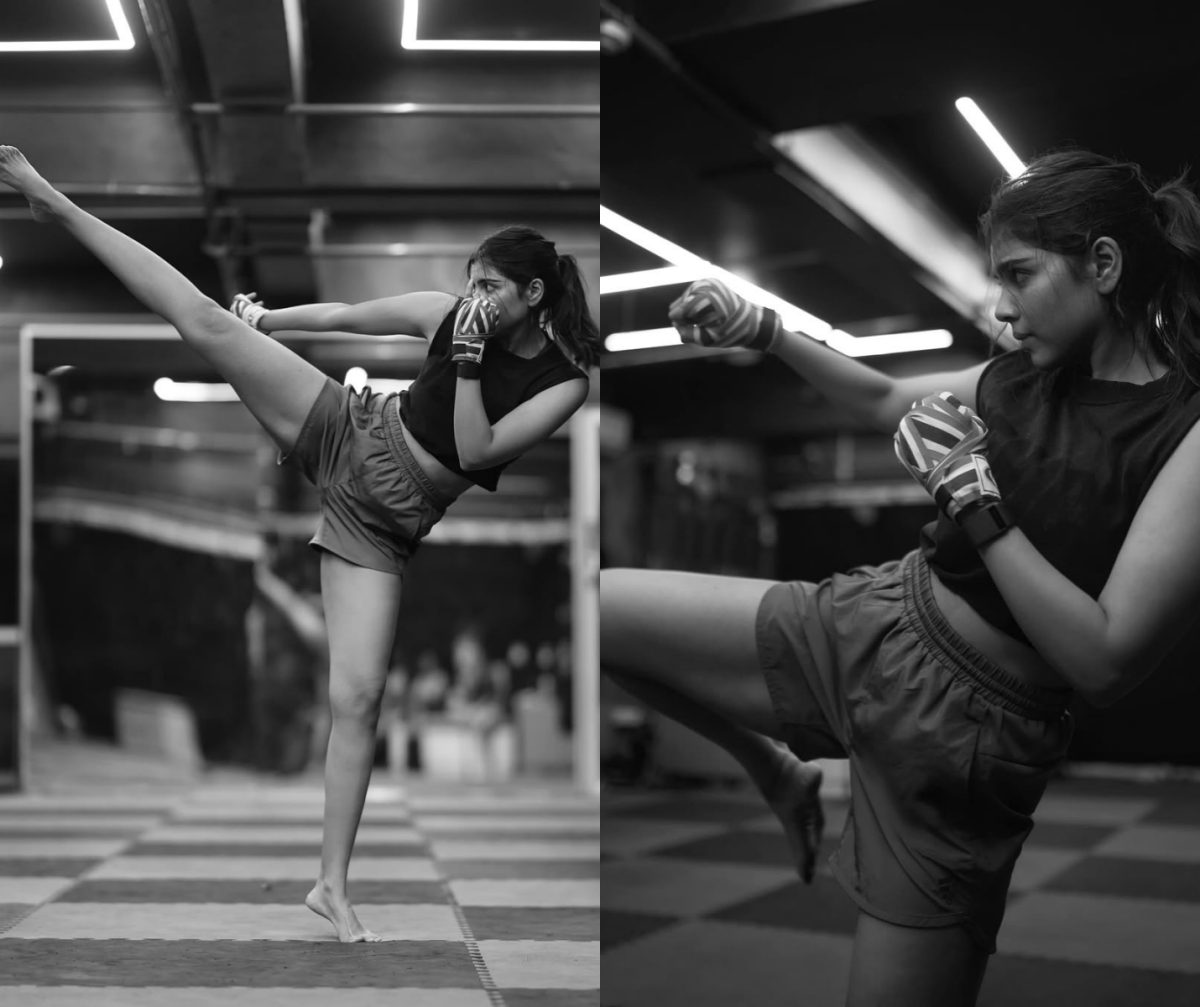 Kalyani Priyadarshan Trains In Martial Art For New Film : മാർഷ്യൽ ആർട്സ് അഭ്യസിക്കുന്ന കല്യാണി പ്രിയദർശന്റെ ചിത്രങ്ങളാണ് സമൂഹമാധ്യമങ്ങളിൽ ശ്രദ്ധേയമാകുന്നത്. ദുൽഖർ സൽമാന്റെ വേഫെറർ ഫിലിംസ് നിർമിക്കുന്ന ഏഴാം ചിത്രത്തിനായാണ് കല്യാണി മാർഷ്യൽ ആർട്സ് അഭ്യസിക്കുന്നത്. ചിത്രത്തിലെ കഥാപാത്രത്തിനുവേണ്ടി കിക്ക് ബോക്സിങ് പരിശീലിക്കുന്ന കല്യാണിയുടെ ചിത്രങ്ങളാണ് വൈറലാവുന്നത്. ‘ഒരു പാർട്ടിയിലും ഇതുവരെ കാണാത്ത എന്റെ പുതിയ വേർഷൻ’ എന്നാ അടികുറിപ്പോടെയാണ് ചിത്രങ്ങൾ പങ്കുവച്ചത്.